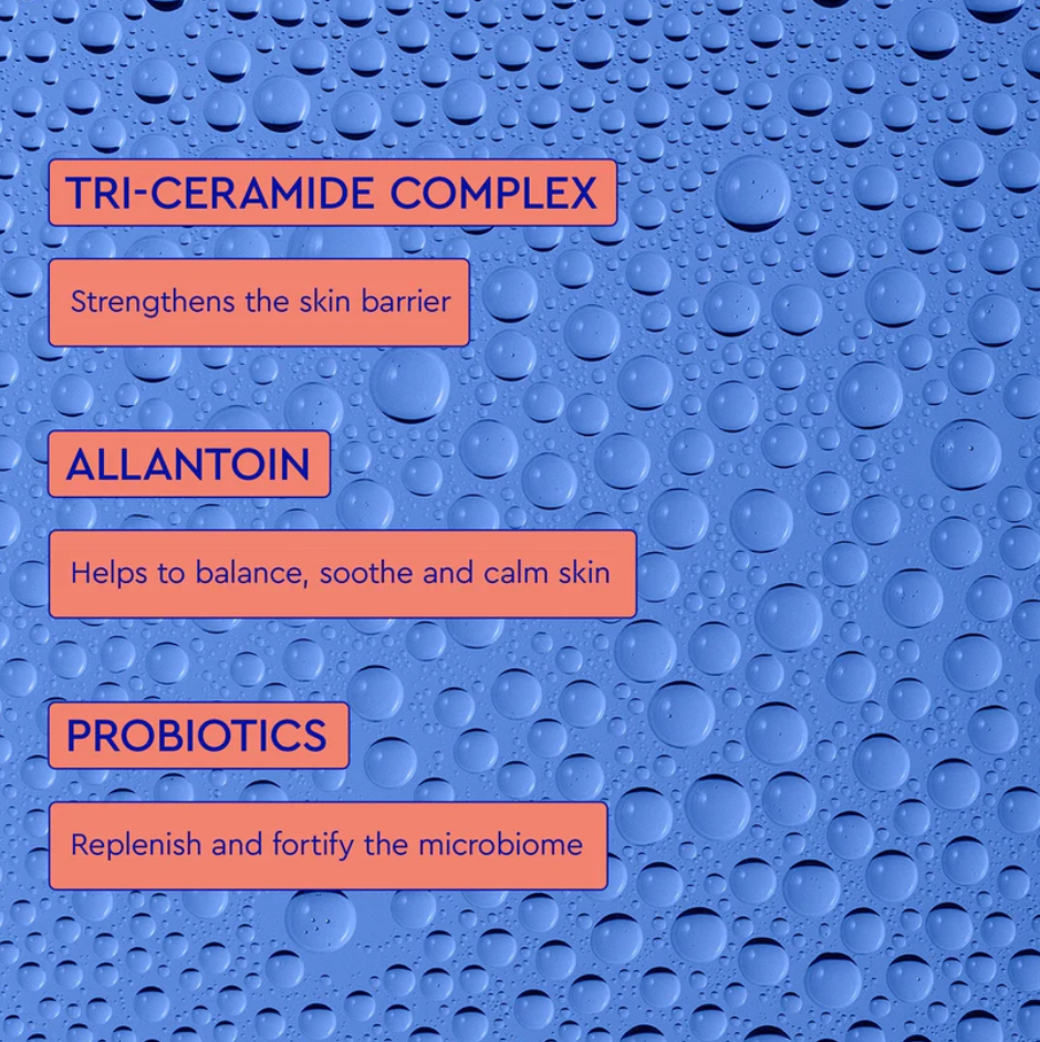 Byoma barrier boosting Tri-Ceramide Complex (Ceramides, Cholesterol, Fatty Acids) plus a powerful duo of Allantoin and probiotic ferment help to immediately hydrate the skin and support the microbiome, shielding skin from environmental stressors and calming dry irritated skin.