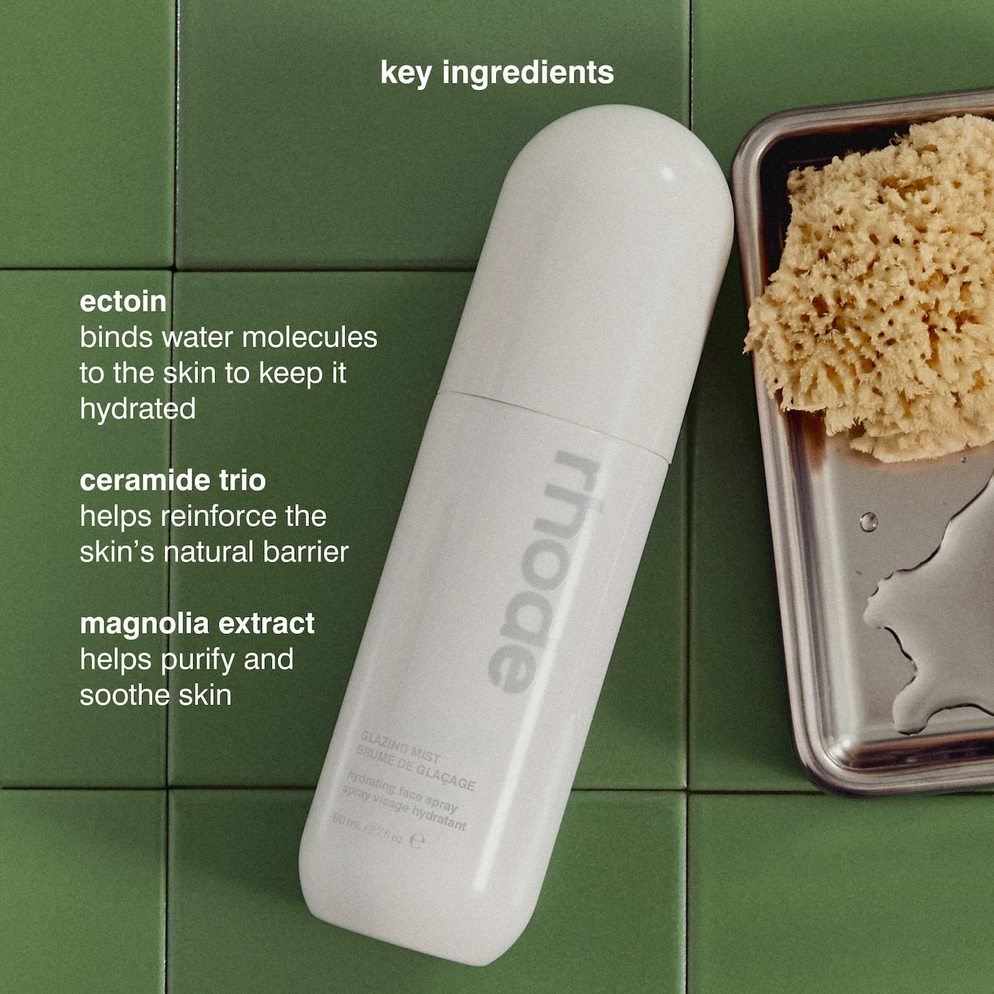What Else You Need to Know: Glazing Mist lets you take the benefits of your rhode routine on the go. It instantly leaves skin looking glazed, supple, and hydrated, providing a glowy, radiant finish that lasts for hours. Our formula also has added purifying benefits, helping skin feel more balanced and clarified over time.