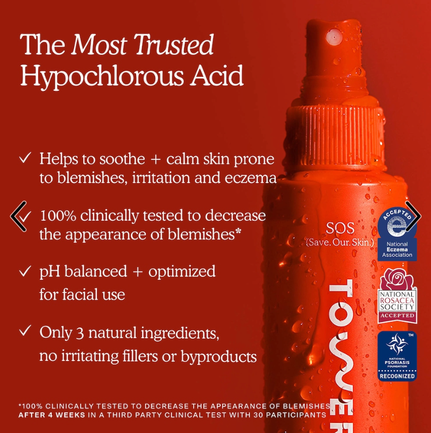 What it is: A clinically proven, derm-approved hypochlorous acid spray that visibly reduces breakouts, redness + calms irritation.